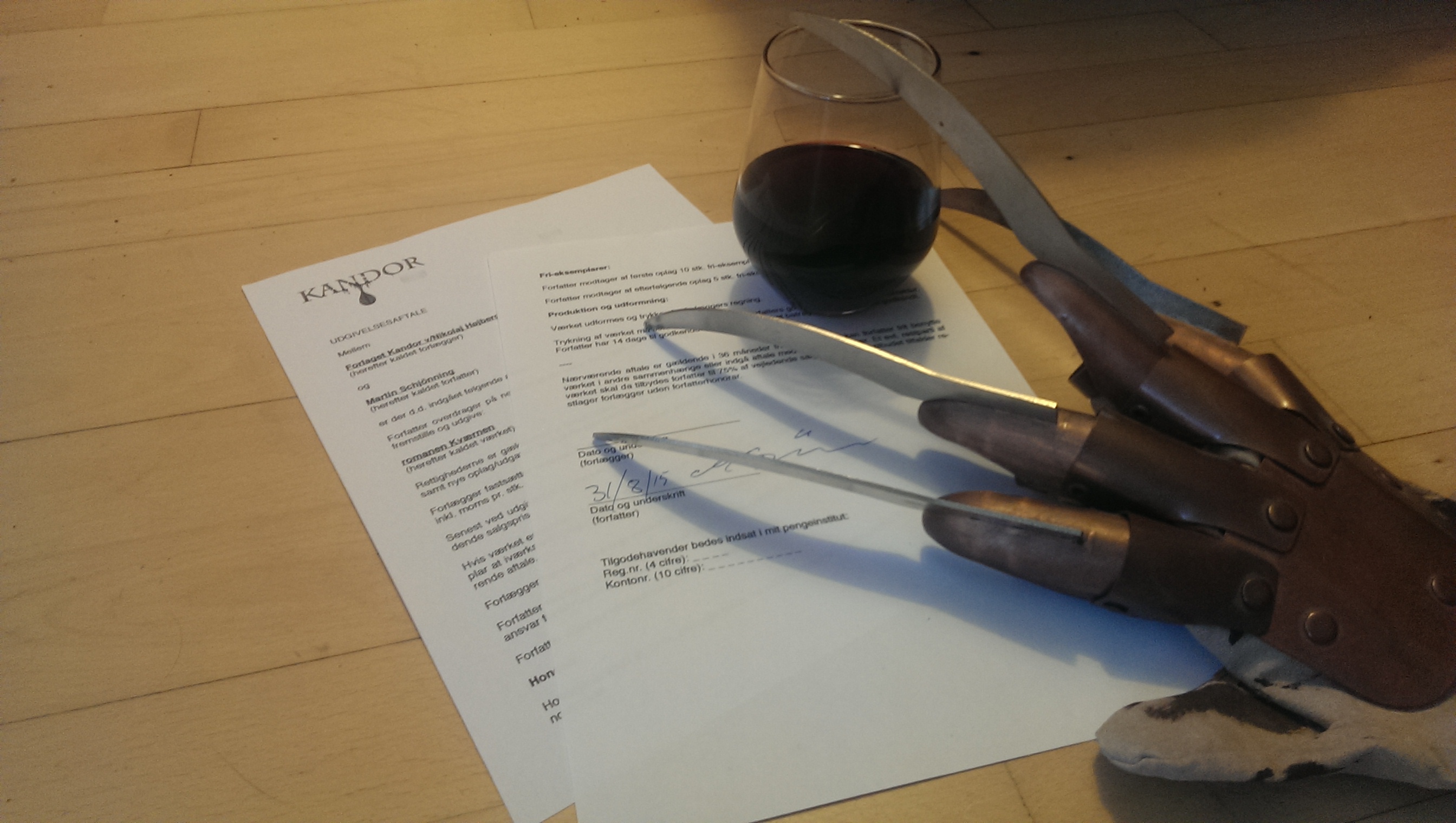 Normalt er der champagne med på billedet, da jeg simpelthen bliver vildt begejstret hver gang nogen vælger at udgive mine skriblerier. Men i dag er en sorgens dag for horror-freaks. Wes Craven, skaberen af et utal af blodige gysere, døde i nat. Hans mest berømte skabelse er den dæmoniske barnemorder/genganger/dæmon, Freddy Krueger – en legendarisk horror-figur, som har sneget sig med på mit billede, sammen med et afdæmpet glas rødvin. Craven er død, horror-genren, som han betød så meget for, lever videre.